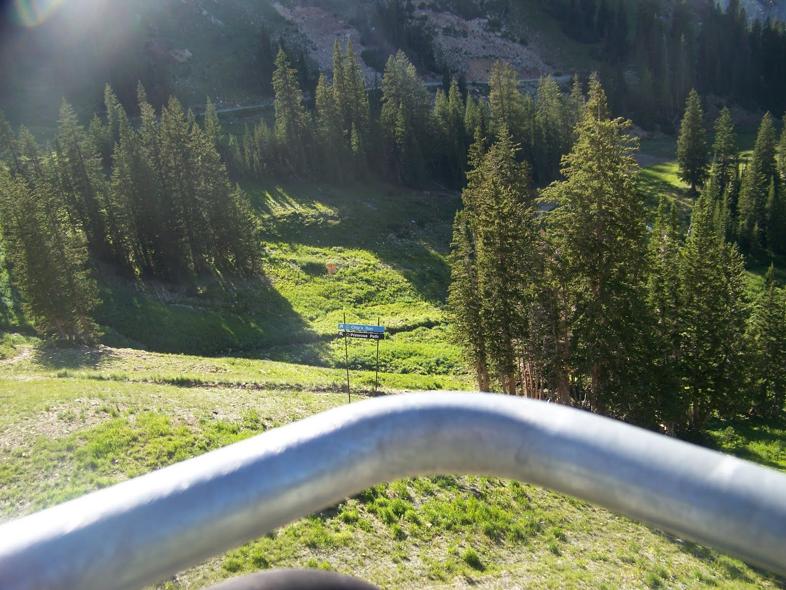 It was beautiful and very quiet on the ski lift. The mountain side was green with patches of wildflowers all over. I know it shows brown in this picture...that is where the paths are for hiking and biking in the summer and skiing in the winter.